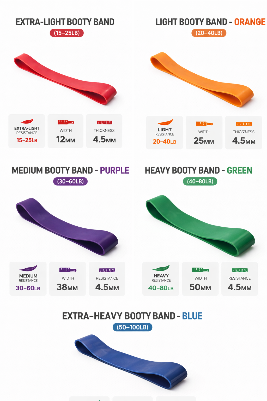 5pcs Heavy Duty Booty Band Set Level up your lower body training with this set of 5 heavy-duty booty bands, designed specifically for glute, hip, and leg activation. Made from premium natural latex with a durable 4.5mm thickness, these loop bands provide consistent resistance without rolling or snapping. Compact and portable, booty bands are perfect for adding intensity to squats, lunges, hip thrusts, and warm-ups. With five resistance levels in one set, they’re suitable for all fitness levels from beginners working on form to advanced athletes targeting glute growth and strength.